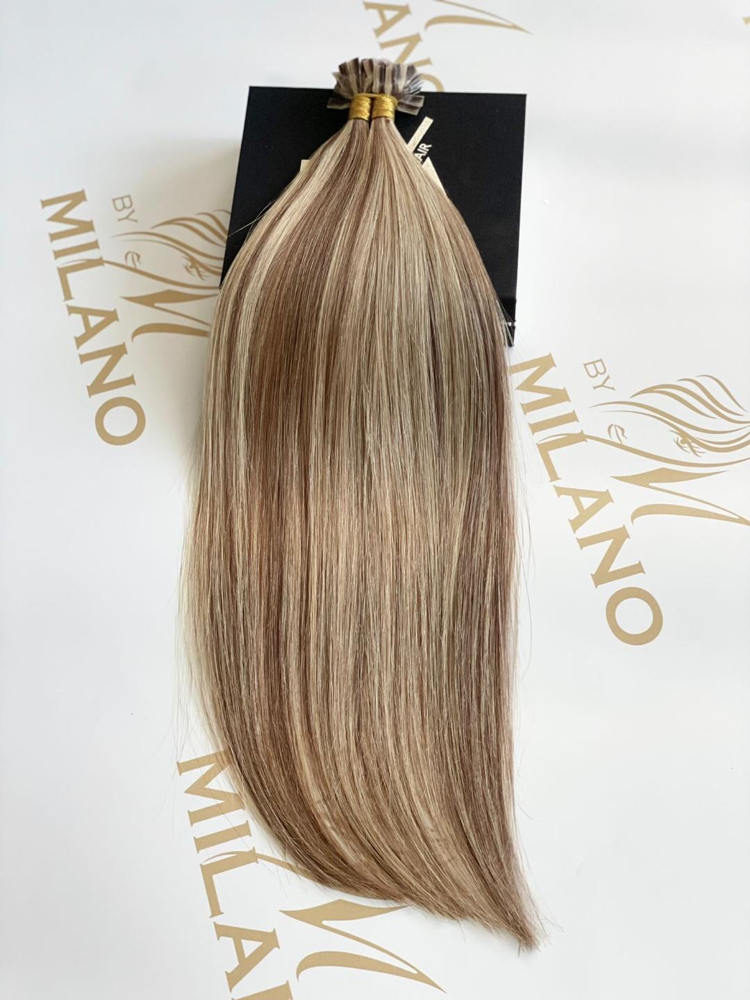 The set has 100 strands, 100-120 gr. hair, microkeratin type keratin, flat shape for an invisible hold of the extensions